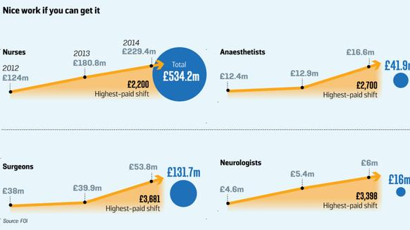 SPECIALISTS and nursing staff are pocketing thousands of pounds for a single shift working as a locum for the NHS, with surgeons costing nearly £3,700 and nurses up to £2,200. The figures, obtained by The Sunday Times under the Freedom of Information Act, illustrate the increasing reliance of hospital trusts on expensive agency staff.