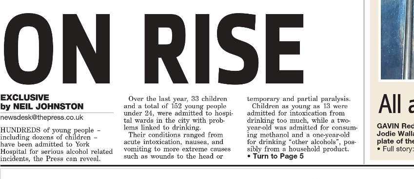Exclusive: HUNDREDS of young people – including dozens of children – have been admitted to York Hospital for serious alcohol related incidents, the Press can reveal. Over the last year, 33 children and a total of 152 young people under 24, were admitted to hospital wards in the city with problems linked to drinking.